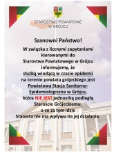 W związku z licznymi zapytaniami kierowanymi do Starostwa Powiatowego w Grójcu informujemy, że służbą wiodącą w czasie epidemii na terenie powiatu grójeckiego jest Powiatowa Stacja Sanitarno-Epidemiologiczna w Grójcu, która NIE JEST jednostką podległą Staroście Grójeckiemu, a co za tym idzie Starosta nie ma wpływu na jej działania.
