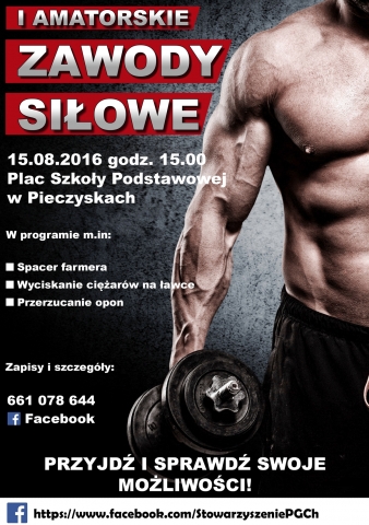 Stowarzyszenie Przyjaciół Gminy Chynów pragnie zaprosić do wzięcia udziału w I Zawodach Siłowych w Gminie Chynów! Formuła zawodów jest zbliżona do słynnych zawodów „Strongman”! Jeżeli chcesz sprawdzić, na co Cię stać i rywalizować z innymi siłaczami o miano najsilniejszego człowieka w Gminie Chynów – zapraszamy ! Zawody odbędą się 15 sierpnia na terenie placu Szkoły Podstawowej w Pieczyskach i rozpoczną się o godzinie 15.00. Nie ma wpisowego! Zapisy proszę kierować na adres: spgch2012@gmail.com lub zgłaszać na oficjalnym profilu Facebook Stowarzyszenia: https://www.facebook.com/StowarzyszeniePGCh/