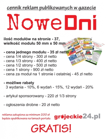 Dołącz do kilkuset firm, reklamuj się u nas. Najbliższe wydanie gazety Nowe Dni już 13.10.16. Zapraszamy Nowe Dni & grojeckie24.pl. Kontakt: reklama@nowedni.pl, Daniel Krzechowicz - 504-198-135. Artur Banasiewicz - 510-005-664, Marcin Nowicki - 504-030-051.