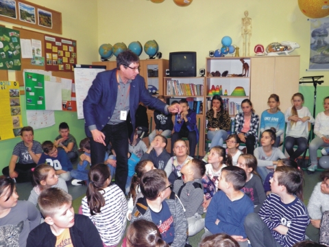 Pan profesor zajmuje się także popularyzowaniem zagadnień związanych z fizyką i chemią wśród uczniów szkół podstawowych i gimnazjalnych. Właśnie w tym celu przyjechał do naszej szkoły. W bardzo interesujący sposób opowiadał o atomach, mieszaniu się substancji o różnej gęstości, napięciu powierzchniowym i innych ciekawych zjawiskach. Podczas spotkania zostały przeprowadzone liczne eksperymenty i doświadczenia, które dzieci mogły nie tylko obserwować, ale też brać w nich udział. Niezwykle ciekawy sposób przekazywania wiedzy przez pana profesora sprawił, że ta niestandardowa lekcja fizyki spotkała się z dużym zainteresowaniem.