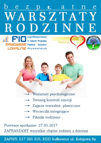 Mamy przyjemność zaprosić całe rodziny do uczestnictwa w Warsztatach Rodzinnych organizowanych w ramach FIO 2017 Działaj Lokalnie (Fundusz Inicjatyw Obywatelskich).