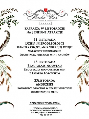 Zapraszamy na wspólną celebrację Narodowego Święta Niepodległości do Małej Wsi. Pałac w Małej Wsi był świadkiem wielu ważnych wydarzeń związanych z odzyskaniem niepodległości przez Polskę w 1918 roku - tu mieszkał książę regent Zdzisław Lubomirski, który przekazał władzę Józefowi Piłsudskiemu, tu odbywało się wiele spotkań poprzedzających to wydarzenie. Niezwykłe miejsce, świadek wielu historii i miejsce zamieszkania wielu bohaterów naszego narodu doczekał się pierwszej pracy opisującej jego dzieje!
