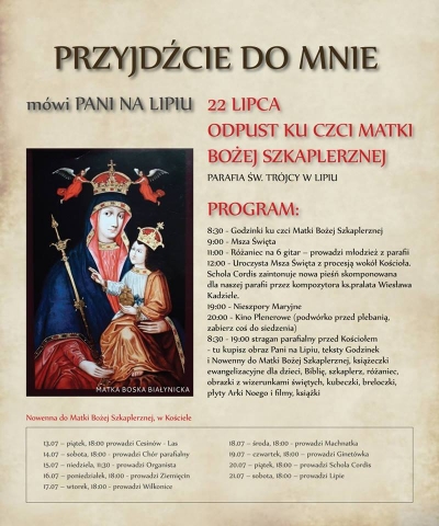Młodzieżowa Grupa Parafialna oraz Ksiądz Proboszcz z Parafii Św.Trójcy w Lipiu zapraszają w najbliższą niedzielę na odpust parafialny. Będziemy wielbić naszą Panią na Lipiu – Matkę Bożą Szkaplerzną, można przynieść własne kwiaty przed obraz Maryi.