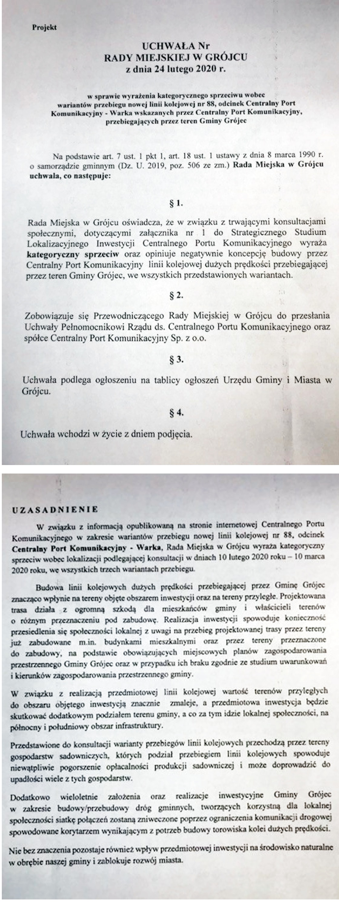 Uchwała Rady Powiatu ma dotyczyć przebiegu linii przez teren powiatu grójeckiego. Uchwała została podjęta w związku z trwającymi konsultacjami społecznymi, dotyczącymi załącznika nr 1 do Strategicznego Studium Lokalizacyjnego Inwestycji Centralny Port Komunikacyjny.