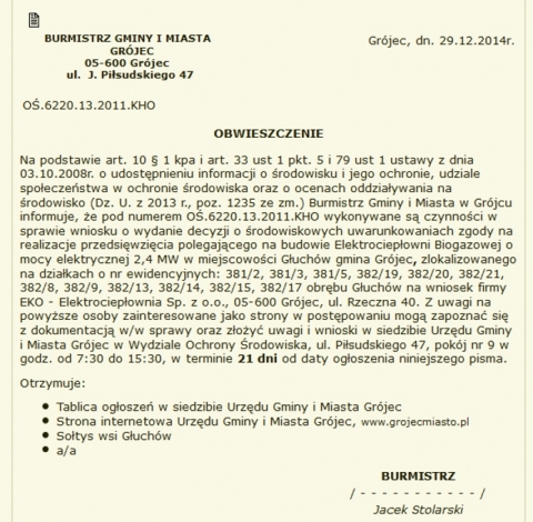 Na podstawie art. 10 § 1 kpa i art. 33 ust 1 pkt. 5 i 79 ust 1 ustawy z dnia 03.10.2008r. o udostępnieniu informacji o środowisku i jego ochronie, udziale społeczeństwa w ochronie środowiska oraz o ocenach oddziaływania na środowisko (Dz. U. z 2013 r., poz. 1235 ze zm.) Burmistrz Gminy i Miasta w Grójcu informuje, że pod numerem OŚ.6220.13.2011.KHO wykonywane są czynności w sprawie wniosku o wydanie decyzji o środowiskowych uwarunkowaniach zgody na realizacje przedsięwzięcia polegającego na budowie Elektrociepłowni Biogazowej o mocy elektrycznej 2,4 MW w miejscowości Głuchów gmina Grójec, zlokalizowanego na działkach o nr ewidencyjnych: 381/2, 381/3, 381/5, 382/19, 382/20, 382/21, 382/8, 382/9, 382/13, 382/14, 382/15, 382/17 obrębu Głuchów na wniosek firmy EKO - Elektrociepłownia Sp. z o.o., 05-600 Grójec, ul. Rzeczna 40. Z uwagi na powyższe osoby zainteresowane jako strony w postępowaniu mogą zapoznać się z dokumentacją w/w sprawy oraz złożyć uwagi i wnioski w siedzibie Urzędu Gminy i Miasta Grójec w Wydziale Ochrony Środowiska, ul. Piłsudskiego 47, pokój nr 9 w godz. od 7:30 do 15:30, w terminie 21 dni od daty ogłoszenia niniejszego pisma.