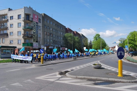 Pierwszy odbył się 29 marca 2015r. Solidaryzując się z osobami dotknietymi autyzmem szliśmy ulicami naszego miasta z hasłem ,,NA NIEBIESKO DLA AUTYZMU”. Razem z uczniami okolicznych szkół podstawowych, przedszkoli, policji, wojska, wesoło kroczyliśmy ulicami naszego miasta. Podczas marszu, ci których mijaliśmy mogli usłyszeć, co to jest autyzm, gdzie szukać pomocy i wsparcia.