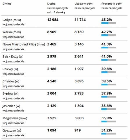 Poziom zaszczepienia mieszkańców w gminach powiatu grójeckiego przeciw koronawirusowi.
