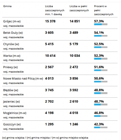 Poziom zaszczepienia mieszkańców w gminach powiatu grójeckiego przeciw koronawirusowi.