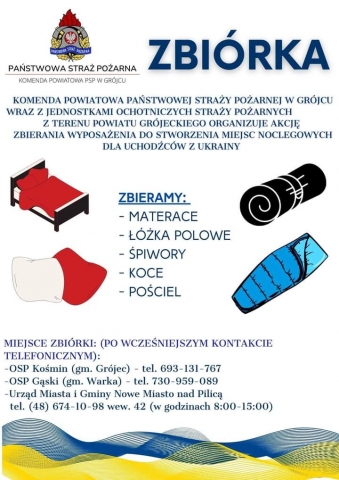 KOMENDA POWIATOWA PAŃSTWOWEJ STRAŻY POŻARNEJ W GRÓJCU WRAZ Z JEDNOSTKAMI OCHOTNICZYCH STRAŻY POŻARNYCH Z TERENU POWIATU GRÓJECKIEGO ORGANIZUJE AKCJĘ ZBIERANIA WYPOSAŻENIA DO STWORZENIA MIEJSC NOCLEGOWYCH DLA UCHODŹCÓW Z UKRAINY