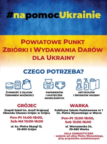 W Powiatowych Punktach Zbiórki i Wydawania Darów dla Ukrainy w GRÓJCU I WARCE potrzeba: