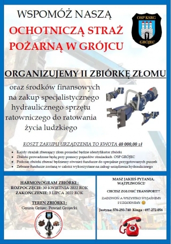 Rozpoczynamy kolejną drugą już w historii naszej jednostki akcję pt. ,,Zbiórka złomu". W tym roku zebraną kwotę chcemy przeznaczyć na zakup specjalistycznych nożyc hydraulicznych zasilanych bateriami.