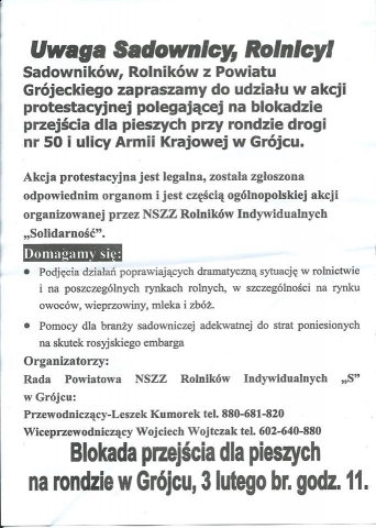 Dziś od godziny 11.00 rolnicy skupieni w Solidarności RI będą blokować trasę krajową nr. 50 w Grójcu.