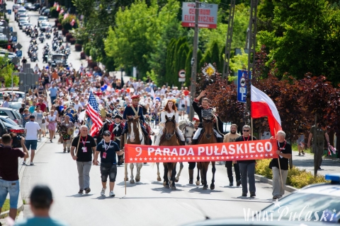 Następnie goście, grupy rekonstrukcyjne, przedstawiciele organizacji, instytucji i szkół oraz mieszkańcy wzięli udział w niezwykłym wydarzeniu jakim jest jedyna w Polsce Parada Pułaskiego. Jak co roku wyruszyła ona z wareckiego rynku w rytm muzyki Orkiestry Moderato i ulicami miasta dotarła do winiarskiego parku przy muzeum. Poprowadził ją sam Generał Kazimierz Pułaski na koniu, a towarzyszyła mu Franciszka Krasińska i jeden z konfederatów. Tuż za nimi pomaszerowali członkowie grup rekonstrukcyjnych w mundurach z okresu walk Kazimierza Pułaskiego w Ameryce, Indianie Huu - Ska Luta, a także uczniowie z Zespołu Szkół im. 1 PLM „Warszawa” w Warce i Państwowego Liceum Sztuk Plastycznych im. Józefa Chełmońskiego w Nałęczowie, w strojach historycznych.