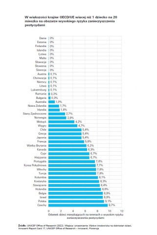Według raportu UNICEF, w krajach bogatych średnio co dwudzieste dziecko mieszka na obszarach o wysokim ryzyku zanieczyszczenia pestycydami. Niestety w Polsce ten odsetek jest dużo wyższy. W naszym kraju niemal co dziesiąte dziecko mieszka na takich obszarach.