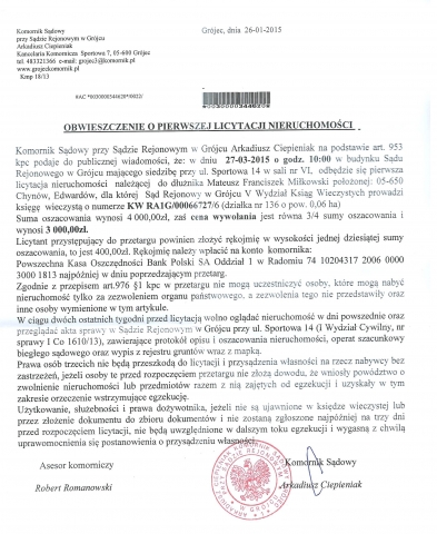 Obwieszczenie o pierwszej licytacji nieruchomości (Km 18/13)