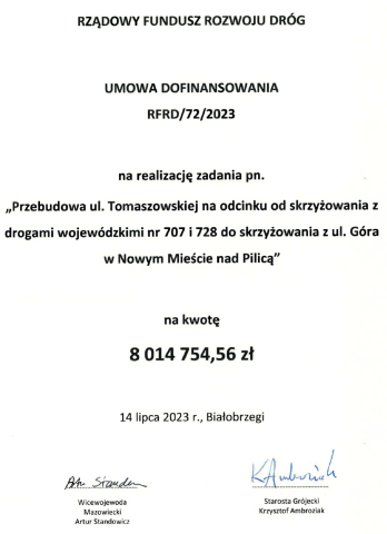 W imieniu Powiatu Grójeckiego umowę podpisali Starosta Krzysztof Ambroziak, Członek Zarządu – Marzena Kołacz – Rosołowska przy kontrasygnacie Skarbnika Witolda Kępki. Mazowiecki Urząd Wojewódzki reprezentował Wicewojewoda Mazowiecki Artur Standowicz.