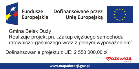 Gmina Belsk Duży realizuje projekt pn. „Zakup ciężkiego samochodu ratowniczo-gaśniczego wraz z pełnym wyposażeniem” w ramach umowy o dofinansowanie nr FEMA.02.04-IP.01-005V/23-00 zawartej w dniu 16 lutego 2024 r., pomiędzy Samorządem Województwa Mazowieckiego a Gminą Belsk Duży.
