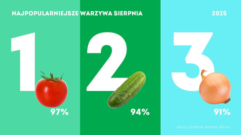 W sierpniu najczęściej spożywanym warzywem były pomidory, których konsumpcję zadeklarowało aż 97% Polaków. Na drugim miejscu wśród warzyw znalazły się ogórki, które jadło 94% badanych. Trzecie miejsce należy do cebuli - poziom 91%.