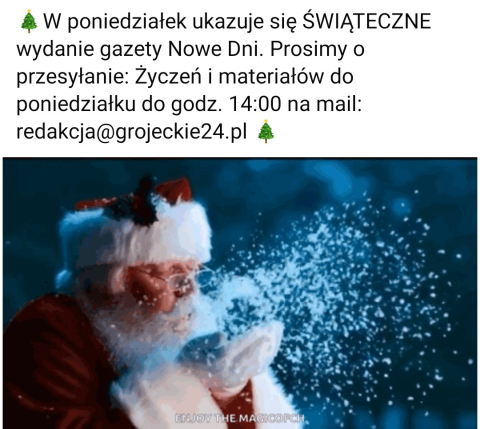 W poniedziałek ukazuje się ŚWIĄTECZNE wydanie gazety Nowe Dni. Prosimy o przesyłanie: Życzeń i materiałów do poniedziałku do godz. 14:00 na mail: redakcja@grojeckie24.pl
