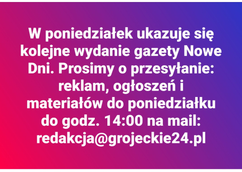 Prosimy o przesyłanie: reklam, ogłoszeń i materiałów do poniedziałku do godz. 14:00 na mail: redakcja@grojeckie24.pl