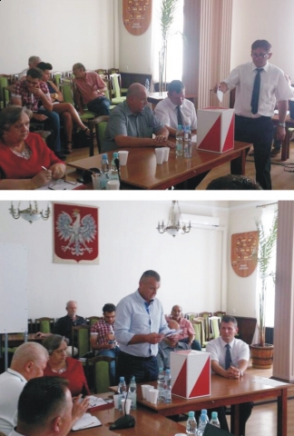 (Na zdjęciach: u góry Janusz Karbowiak podczas głosowania. Na dole Dariusz Piątkowski odczytuje wynik.)