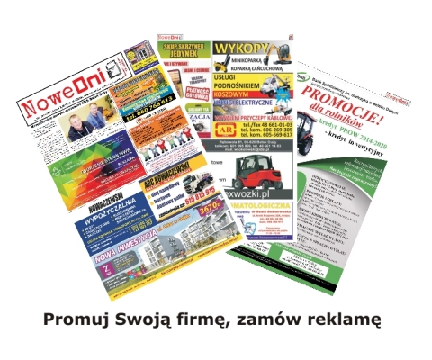 Dołącz do kilkuset firm, reklamuj się u nas. Zachęcam Państwa do zamieszczenia reklamy Państwa firmy na łamach gazety Nowe Dni. Przy wykupieniu powierzchni reklamowej na cały rok, proponujemy promocję cenową do 30%.