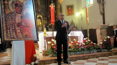 Podczas uroczystości przemówienie wygłosił Starosta Grójecki Marek Ścisłowski. – Zgromadziliśmy się dziś w święto Najświętszej Maryi Panny Królowej Polski, która od stuleci jest z naszym narodem. W dniu dzisiejszym obchodzimy również 225. rocznicę uchwalenia Konstytucji 3 Maja, która była wielkim osiągnięciem myśli politycznej schyłku XVIII w. – mówił Marek Ścisłowski. – Zapoczątkowała ona reformę państwa, próbując wzmocnić jego struktury i ocalić przed zagrożeniem ze strony zaborczych sąsiadów. Jednak plany ocalenia i zreformowania państwa nie powiodły się i Rzeczpospolita na 123 lata została wymazana z mapy Europy. Te wydarzenia utwierdzają nas tylko w przekonaniu, że jedność jest najwyższą wartością. Dzisiaj żyjemy w wolnym kraju, ale ta wolność nie jest nam dana na zawsze. Musimy jej nieustannie strzec – dodał starosta.