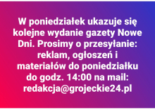 Prosimy o przesyłanie: reklam, ogłoszeń i materiałów do poniedziałku do godz. 14:00 na mail: redakcja@grojeckie24.pl