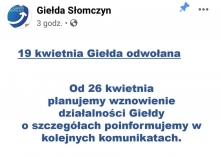 Handel na giełdzie w Słomczynie ma zostać wznowiony 26.04! Link do komunikatu: https://www.facebook.com/113550132062447/posts/2843499169067516/