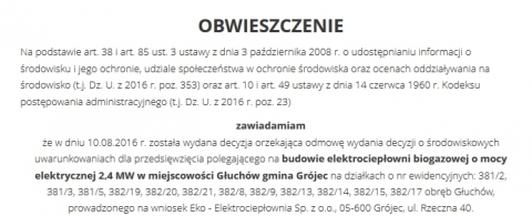 W dniu 10.08. została wydana odmowna decyzja dotycząca środowiskowych uwarunkowań dla budowy elektrociepłowni biogazowej o mocy elektrycznej 2,4 MW w Głuchowie.