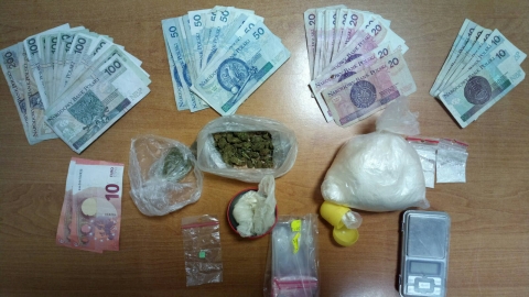 W nocy z 4 na 5 lutego 2017r. policjanci z ogniwa patrolowo-interwencyjnego zatrzymali samochód Chevrolet AVEO, którym poruszali się trzej młodzi mężczyźni. Podczas kontroli w pojeżdzie policjanci ujawnili znaczne ilości środków odurzających w postaci marihuany, amfetaminy oraz extasy. W trakcie przeszukania pojazdu zabezpieczono również wagę elektroniczną i 41 sztuk torebek foliowych z zapięciem strunowym. Zatrzymani zostali osadzeni w policyjnym areszcie.