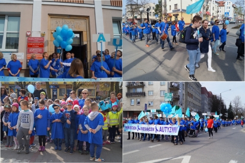 Przy dźwiękach muzyki oraz informacji dotyczących objawów i sposobów pomocy osobom z autyzmem, niebieski marsz dotarł przed budynek Urzędu Miasta gdzie przywitali nas pracownicy urzędu ubrani w niebieskie koszulki, pan Burmistrz Jacek Stolarski oraz Zastępca Burmistrza, pan Karol Biedrzycki. Po odczytaniu przez pana wiceburmistrza informacji dotyczących autyzmu oraz fragmentów pamiętników osoby z autyzmem przeszliśmy przed budynek Starostwa Powiatowego. Przed Starostwem przywitali nas: pan Starosta Marek Ścisłowski, Naczelnik Wydziału Edukacji – pani Barbara Orłowska, Sekretarz Powiatu – pani Sylwia Pietrasiewicz oraz Skarbnik Powiatu – pani Agnieszka Bilska wraz z gronem pracowników urzędu, którzy na znak wsparcia i solidarności założyli również niebieskie koszulki.