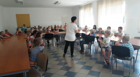 W lipcu br. policjanci spotkali się z uczestnikami półkolonii w Publicznej Szkole Podstawowej w Goszczynie oraz obozu przyrodniczego w Jurkach. Ponadto wszyscy mogli wysłuchać przedstawiciela Powiatowej Stacji Sanitarno – Epidemiologicznej w Grójcu Pani Bożeny Janus, zajmującej się promocją zdrowia. Dzieci chętnie wysłuchały jak powinny dbać o swoje zdrowie, na co zwracać szczególna uwagę podczas grzybobrania, na co muszą uważać, jak odpowiednio reagować podczas zagrożenia, nie tylko swojego, ale także osób przebywających z nimi. Następnie funkcjonariuszka powiedziała o bezpieczeństwie podczas wypoczynku letniego, pobytu nad wodą oraz bezpieczeństwa w ruchu drogowym. Poruszono również temat bezpieczeństwa w internecie i podczas prac polowych. Omówiono również poważne zagrożenia związane z dopalaczami i innymi używkami. Dzieci zadawały dużo pytań i chętnie uczestniczyły w dyskusji, zwłaszcza dotyczącej osób obcych. W spotkaniach uczestniczyło blisko 70 dzieci.