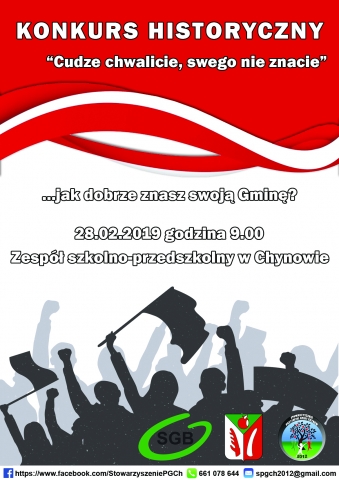 Zapraszamy do udziału w konkursie wiedzy historycznej i współczesnej o Gminie Chynów pt. „Cudze chwalicie, swego nie znacie – czyli konkurs wiedzy o Gminie Chynów". Wydarzenie zaplanowane jest na dzień 28.02.2018 w godzinach 9:00-12:00 w Zespole Szkolno- Przedszkolnym w Chynowie.
