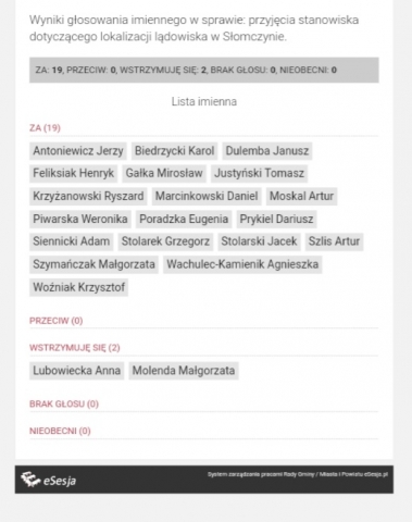 Radni przeciw lądowisku w Słomczynie. 19 radnych za uchwałą, 2 wstrzymało się od głosu