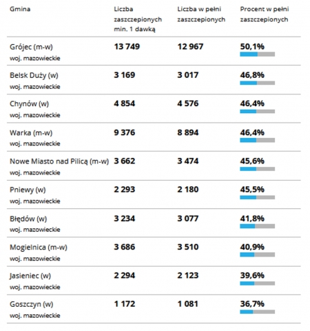 Poziom zaszczepienia mieszkańców w gminach powiatu grójeckiego przeciw koronawirusowi.