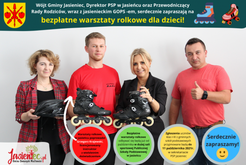 Podczas warsztatów dziecko powinno posiadać własny sprzęt: rolki, kask oraz ochraniacze na kolana, łokcie i nadgarstki. Zapisów można dokonać w sekretariacie PSP w Jasieńcu, ul. Szkolna 7.