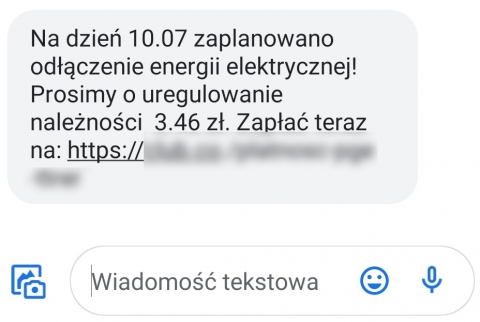 Oszuści znów atakują. Podszywając się pod dostawcę energii wysyłają sms do użytkowników z informacją o konieczności zapłaty zaległości za prąd. Nieuregulowanie wskazanej kwoty spowoduje odłączenie energii elektrycznej. Niestety wejście w zawarty w treści wiadomości link i autoryzowanie transakcji powoduje utratę z konta kwoty znacznie większej niż podana w wiadomości. Bądźmy ostrożni i zawsze weryfikujmy otrzymane wiadomości.