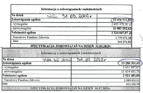 Obecnie stan zobowiązań 13 286 301,43 (stan na dzień 31.07.2022 r., obecnie za mojej kadencji). Zobowiązania SPZOZ-u zmniejszyły się o 6 190 430,1 czyli ponad 6 milionów w okresie mojego 3 letniego zarządzania szpitalem.
