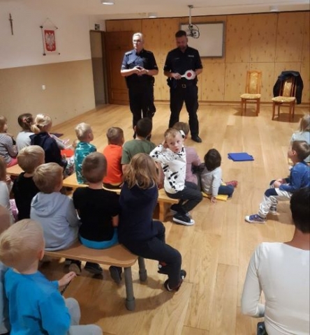 Prowadząca spotkanie asp. szt. Ewelina Kozdruj wspólnie z dzielnicowym z Posterunku Policji w Nowym Mieście nad Pilicą udzielili milusińskim kilka cennych wskazówek dotyczących bezpiecznego poruszania się po drodze i właściwych zachowań w domu. Mundurowi podkreślali, jak ważne dla własnego bezpieczeństwa jest noszenie elementów odblaskowych, szczególnie teraz w okresie jesiennym. Ponadto policjanci omówili jak się zachować podczas spotkania tzw. osoby obcej.
