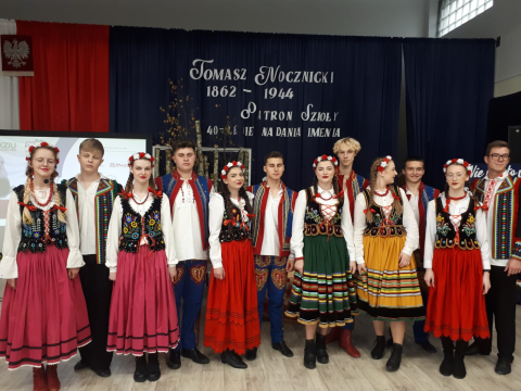 Ważną częścią piątkowej uroczystości był program artystyczny, przygotowany przez uczniów technikum. Zaprezentowali fabularyzowaną biografię Patrona, wzbogaconą wierszami jego autorstwa, a także spektakularny układ wokalno-choreograficzny, stylizowany na taniec ludowy.