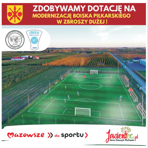 I kolejna z serii nowych dotacji dla Gminy Jasieniec pozyskana z Samorządu Województwa Mazowieckiego. Zdobywamy dofinansowanie w wysokości ponad 225 tys. zł (do 75% wartości zadania) na modernizację boiska piłkarskiego w Zbroszy Dużej. W zakres inwestycji, współfinansowanej z programu "Mazowsze dla sportu", wejdzie m.in. bardzo potrzebna renowacja murawy trawiastego boiska piłkarskiego, które służy nie tylko klubowi sportowemu UKS Iskra Zbrosza Duża, lecz także uczniom miejscowej szkoły podstawowej oraz całej społeczności lokalnej!
