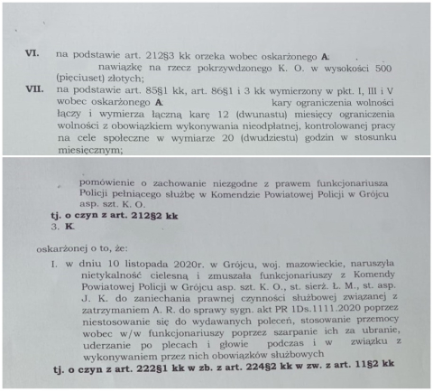 W listopadzie 2020 roku w Grójcu podczas podjętej interwencji wobec osoby stosującej groźby karalne grójeccy policjanci zatrzymali 48-latka. W trakcie czynności służbowych mężczyzna zachowywał się wulgarnie, naruszył nietykalność cielesną funkcjonariuszy z Komendy Powiatowej Policji w Grójcu, próbując zmusić ich do zaniechania prawnych czynności służbowych. Nie reagował na polecenia wydawane przez policjantów oraz ich znieważył. Mężczyzna uszkodził również umyślnie radiowóz policyjny. Córka zatrzymanego chcąc przeszkodzić kryminalnym w czynnościach, dopuściła się naruszenia nietykalności cielesnej oraz zmuszała policjantów do zaniechania prawnej czynności związanej z zatrzymaniem mężczyzny. Ponadto mieszkaniec Grójca zniesławił jednego z policjantów za pośrednictwem portalu społecznościowego. Ich sprawą najpierw zajęli się policjanci i prokurator, a następnie sąd.