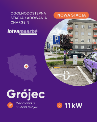 ChargeIn uruchomił nową stację ładowania samochodów elektrycznych w Grójcu. Znajduje się ona na parkingu sklepu Intermarché przy ul. Medalowej 3 i oferuje ładowanie o mocy 11 kW.