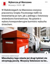 W Białobrzegach wszyscy pracownicy poczty na kwarantannie. Link do artykułu: https://www.facebook.com/116460718114/posts/1